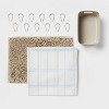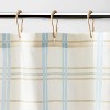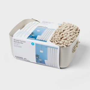 Create a soothing bath space with this 15-Piece Leap Plaid Shower Bundle Set from Room Essentials™. This set includes a plaid shower curtain in blue and ivory hues for elegant style. Designed with a buttonhole top, the curtain is accompanied by 12 hook shower curtain rings for easy hanging. A shag-like bath rug in a solid dark ivory hue and a storage basket with side cutout handles complete the bundle.