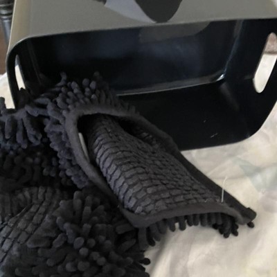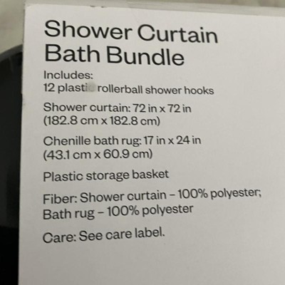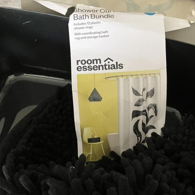 A: The set includes a shower curtain, shower curtain rings, a storage basket, and a rug.