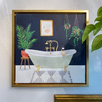 - CUSTOM CANVAS ARTWORK DETAILS: Boho Bath I by Victoria Borges. DESCRIPTION: Bask in the elegant comfort of this vintage bath portrait. Lighter and darker shades of navy make for a rich, textured backdrop, and the delicate potted plants add a bit of life to the scene. ARTIST BIO: Inspired by surface design, impressionism, and the natural world, her work is playful and experimental, with an emphasis on unique textures and color palettes. Her art spans from digital illustration to collage, to acrylic paint.
