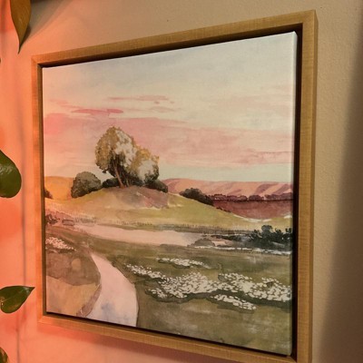 ART DESCRIPTION: An enchanting stream cuts across the picturesque landscape depicted within this piece. The sun has set on the horizon, casting pink colors onto the drifting clouds lingering on the skyline. Majestic green-leafed trees sit atop a hill up ahead, while a towering mountain range looms in the distance. This Amanti Art canvas art print was created by Grace Popp and printed by Amanti Art in Madison WI. The canvas is stretched by hand and finished with a float frame. Individually made using traditional custom framing techniques, it has the quality you would expect from your local frame shop. Because of our attention to detail and focus on artistry, architects, interior designers, and homeowners alike choose this framed canvas artwork to create beautiful living spaces.