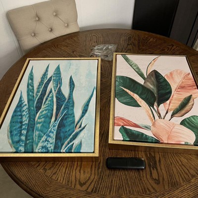 ART DESCRIPTION: A collection of large leaves rendered in green and pink are the feature in this painting. They stand in front of an off-white background with calligraphic text. You get a touch of romance and outdoor charm for your interiors. This Amanti Art canvas art print was created by Eva Watts and printed by Amanti Art in Madison WI. The canvas is stretched by hand and finished with a float frame. Individually made using traditional custom framing techniques, it has the quality you would expect from your local frame shop. Because of our attention to detail and focus on artistry, architects, interior designers, and homeowners alike choose this framed canvas artwork to create beautiful living spaces.
