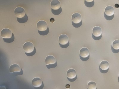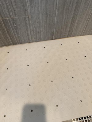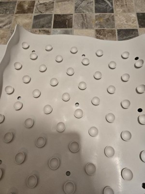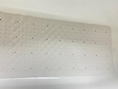 This is a terrific rubber non-slip bath mat that will be perfect when we have elderly house guests. It's just the right shape and size for our standard-sized tub. It's not as white as the tub, but that's a practical matter because bath mats get a bit grubby anyway. I like that this non-slip mat has drain holes at regular intervals, and the bottom is covered in suction cups. You may be interested to note that the care instructions recommend removing the mat after every use so it can dry, plus cleaning it with a mild bathroom cleanser from time to time.