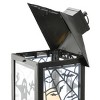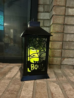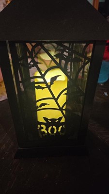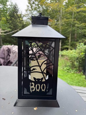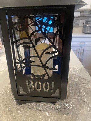This lantern decoration features durable metal construction painted in a matte black finish. Two of the clear panes repeat a Spooky ghost rises up, the other two panes repeat spider webs and black bats, the largest shouting BOO! The lantern contains a single pillar style candle with battery-operated LED light that glows from inside. For indoor or outdoor display on tabletop or hanging from loop.