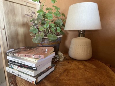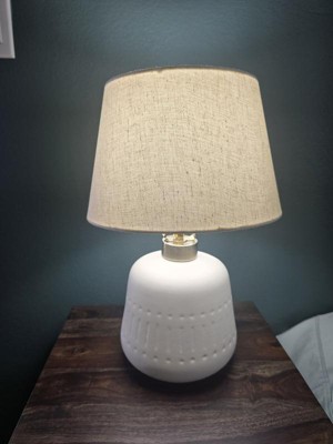Cast a warm glow over your side or accent table with this textured ceramic table lamp. Its rounded geometric base is crafted in a neutral cream tone and is engraved with an understated tribal design. With its rough, unglazed finish and small form, it brings simplistic beauty to a variety of decor styles - from boho to contemporary and farmhouse. Complemented by a heathered shade that diffuses a warm glow into your space.