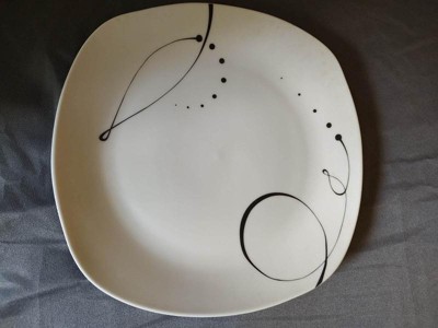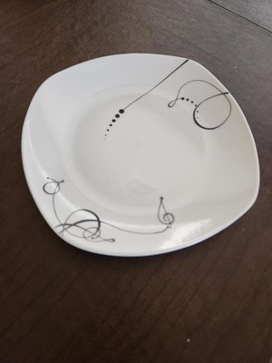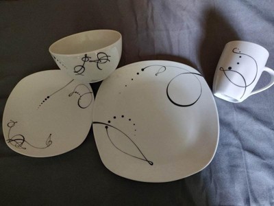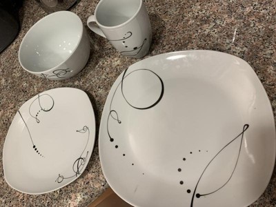 [This review was collected as part of a promotion.] My son has just graduated and will be moving out soon so he is in need of household items. The dishes come as a 16 piece set with 4 dinner plates, 4 salad plates, 4 mugs and 4 bowls. The plates are a rounded square shape with a black swirl design that gives them a modern look. They are a nice weight and feel sturdy as opposed to cheap so I am very happy to give these to my son as a gift!
