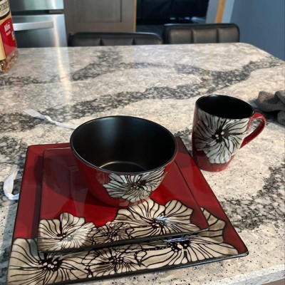 16pc Stoneware Garden Flower Dinnerware Set Red - Elama: Square Floral Dishes Set, Service for 4, Microwave & Dishwasher Safe
