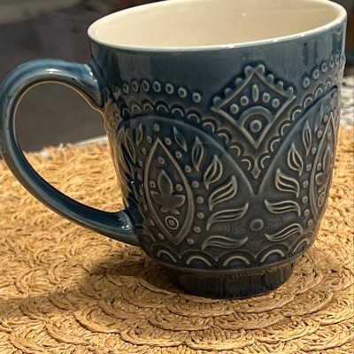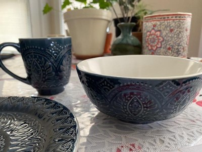 16pc Stoneware Mandala Embossed Dinnerware Set Blue - Elama: Classic Lace Pattern, Service for 4, Microwave & Dishwasher Safe