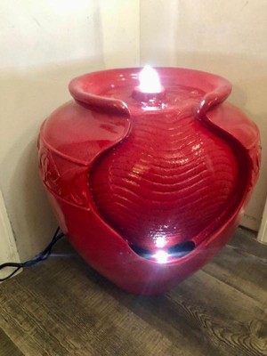 [This review was collected as part of a promotion.] I love the waterfall sound and how it flows down. Perfect size for indoor and outdoor use. Definitely a statement piece, everyone that sees it wants one. Easy to refill and has a nice glowing night for ambiance. Elegant and a deeper red very pretty!