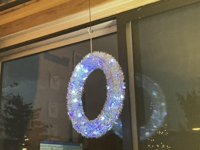 Put together glowing seasonal space with the help of this 17.5-Inch Christmas LED light Wreath from Wondershop™. This Christmas wreath is decorated with tinsel and features LED lights to brighten up the look of any room. Made of metal, this LED wreath comes with a built-in loop for easy display and requires 2 LR44 alkaline batteries for operation.