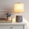 Style up your contemporary decor with this Blue/White Medium Assembled Ceramic Table Lamp from Threshold™. This decorative table lamp makes a welcome addition to your indoor lighting. It features a blue and white abstract pattern on a bud-shaped ceramic base for modern flair. The off - white drum diffuses light with a warm, cozy glow, while the one-way light setting with an on/off switch allows for easy operation. Place it on the side table next to your sofa in your living room, on your console or sideboard to add some color and pattern to plain walls.