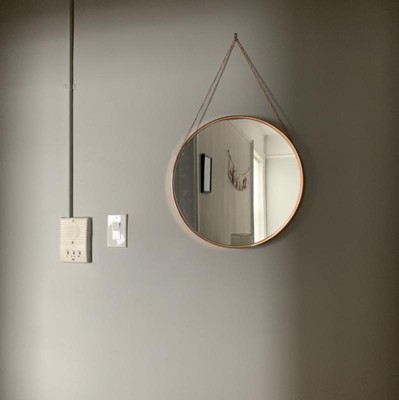 I was looking for something just like this a round mirror with a chain, not rope, to hang in my entryway. This was thicker than I thought it would be and I didn’t realize it would be rose gold around the edge but it still looks nice for the price. It didn’t come with anything to hang it with but I used a standard picture frame hanger and that seems to hold.