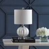 Topped with a white linen shade, this petite glass table lamp refreshes any space with its iridescent ivory finish and subtle ribbed detail. The glass iridescence shimmers like a pearl in contrast to the subtle shimmer of the faux silk drum shade. A crystal finial and base, chrome accents, and a silk-wrapped cord complete the look.