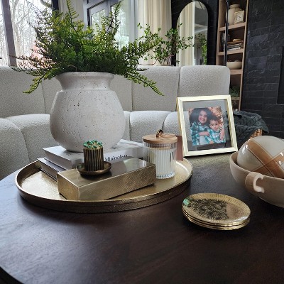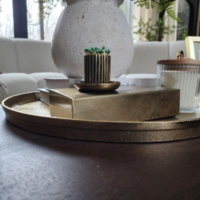 - Gold-finish round decorative tray lends a touch of glam to your tabletop