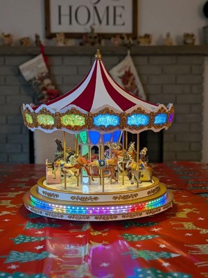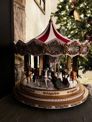 [This review was collected as part of a promotion.] A beautifully well made carousel decor perfect for the holiday season! No setup required. It lights up with music and spins upon plugged in- very intricate but fun to have next to my Christmas trees