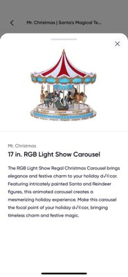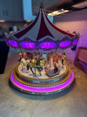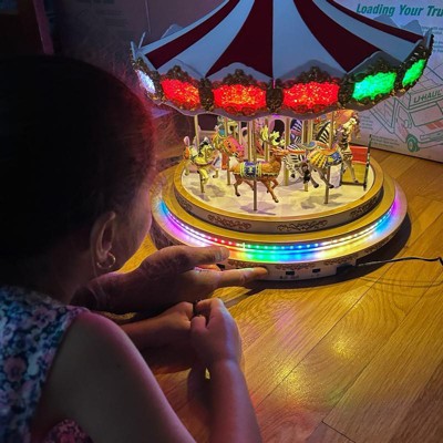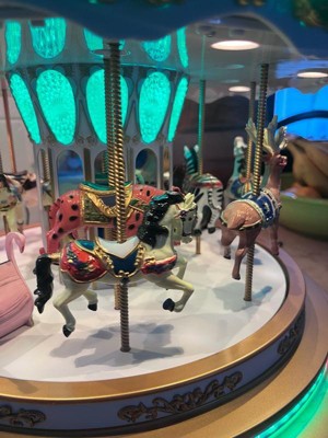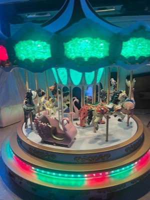 [This review was collected as part of a promotion.] This carousel is a masterpiece! I was honestly shocked by the size of the box, but it was well packaged. For some reason, I thought it had wooden parts. Aside from the velour top, it’s all plastic. Still, the craftsmanship is beautiful and every little element makes it feel special. My daughter kept saying how beautiful it was, and even my husband was impressed. He said it’s something we’ll keep forever and it’ll be our new family heirloom. He really liked that it plays both classic carousel tunes and Christmas music, so it’s not limited to just the holiday season. The only thing he mentioned was that he wished the LED strip had a frosted cover to blend in better, but we get that it’s meant to mimic a traditional carousel. I can see why it has a higher price point. The quality, design and movement of the animals make it worth it. I also love that the volume doesn’t reset when turned off. The colors are vibrant, the sound is clear and we found ourselves just sitting there, watching it spin for nearly an hour.