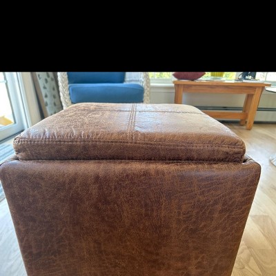 A: Dear Customer, Thank you for inquiring about our Simpli Home Rockwood Cube Storage Ottoman. Fabric used in the Ottoman is Faux Air Leather. Upholstered with a durable Distressed Chestnut Brown Faux Air Leather. If you need further details please reach back to us through our website. Thanks Again