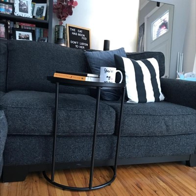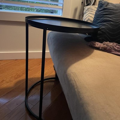 I adore this side table. It is great for spaces where floor space is limited. It tucks right under furniture so it can slide in to maximize free floor space. The top is large enough to fit a full size dinner plate, glass and wine glas with room to spare. I love the lip on the table top which prevents things from sliding off. Bonus points for coming fully assembled! Seriously considering buying a second one.