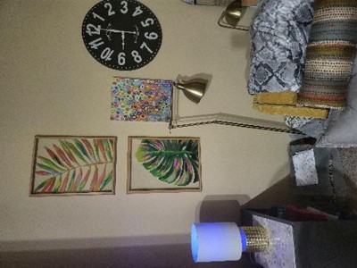 Beautiful art piece! The design and colors are amazing! The piece is better in person. Very well made. I love how you can see through the glass on to the wall. Gives it wonderful dimension. Highly recommend.