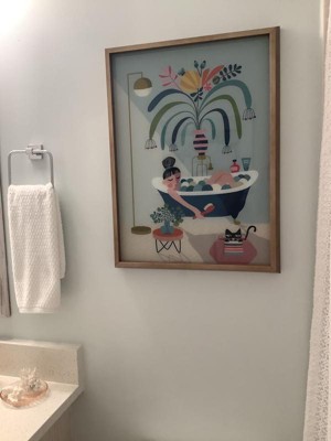 Immerse yourself in the calming waters of self care with this lovely bathroom art print. Framed in a sleek modern frame, this contemporary design is the perfect art piece to add to your home decor collection. Printed and framed in the USA in Waunakee, Wisconsin, this printed glass art will be a pleasure to look at every day in your living room, bedroom, office, or any room in the home. This print also makes an excellent gift for a birthday, holiday, or house-warming. It also has two hangers already attached for easy wall display. The outer dimensions are 24 inches by 18 inches. Print name: "Time to Relax"
