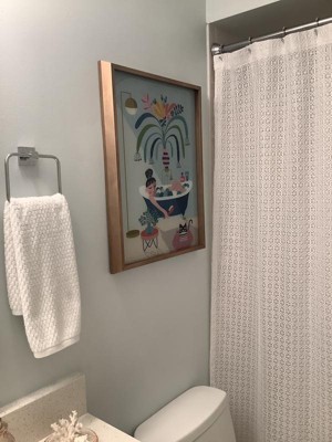 - TRANSITIONAL GLASS WALL ART: Relaxing bathroom art on framed printed glass. Display dimensions are 24 inches by 18 inches