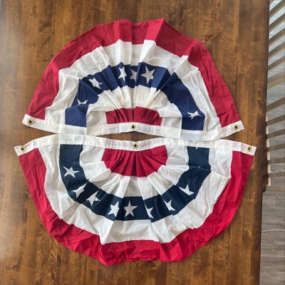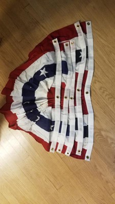 This 1.5 X 3 ft. decorative mini bunting banner by Betsy Flag's® is made of woven poly-cotton (70% polyester and 30% cotton). Our Sentinel poly-cotton fabric dries quickly and is very light weight. This flag has been tested for its strength, durability, lasting color, and fly ability. Betsy Flags by Valley Forge is proud to make FMAA certified flags. U.S. law requires every American flag to be labeled with its country of origin. Look for the “Certified Made in U.S.A.” label, which verifies that your flag has been made in the United States with materials that are domestic in origin and that all processes in every step of its manufacturing were completed in U.S. facilities with U.S. labor. Valley Forge stands behind its promise to ensure domestically made products. This flag measures one and a half feet by three feet, making it ideal for hanging off of a deck or in front of your entryway. It features two red stripes, two white stripes and one central blue stripe with stars. Within the white canvas header are three brass grommets; one on each corner and one in the center. These brass grommets can be used to secure the fan flag for display. It is constructed with a double stitched reinforced fly-hem with a single stitched top and bottom hem. This product is created from our most economical material and is best suited for indoor decoration or occasional outdoor residential use.