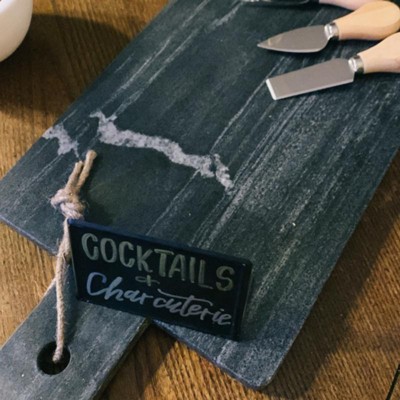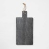 Update your kitchenware with this Marble Large Cutting Board from Threshold™ that's perfect to meet your everyday needs for cutting, slicing and serving. Crafted from black marble with textural accents for timeless appeal, this large cutting board is finished off with curved sides for an elevated look that easily integrates with your existing serveware. The cutout handle makes it convenient to hold and carry, while the inner hole with attached rope makes it easy to hang above the kitchen counter or any other place for space-saving storage. Offering ample space for fruits, pies, baked food, deli meats and other delicious treats, this rectangle cutting board lends functional flair to your kitchenware.