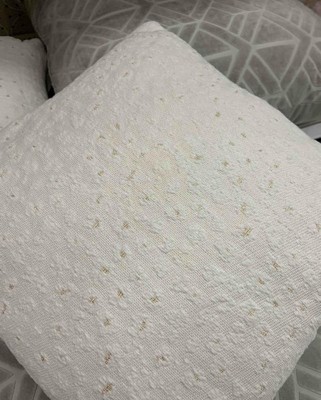 [This review was collected as part of a promotion.] This is a very pretty and preppy pillow. It is mostly white and has some shiny gold woven in it. The pillow also has a texture to it. I tried to get a close up so you could see but it adds some depth to the pillow. The pillow is slightly firm so it should keep its shape over time and will hold up well. It is not small either. It is white and the cover is not removable but I think you could spot treat it if needed. I received an incentive to write this review.