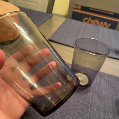 Absolutely love these! They have that pretty dark gray/blackish tint to them. They are wider than most glass cups. As for the negative reviews about it not being clear, it said it’s GRAY above the picture. I think they are a lot more attractive than clear glasses.