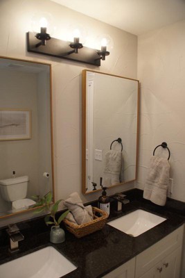 This mirror has the perfect beveled sidings paired with the wood touches. It feels modern yet interesting which can be a hard balance. We bought two of them and used them in our master bathroom. They really open up the tight space! @hopedanyla
