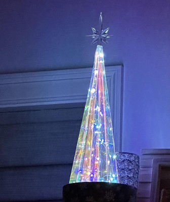 A: The tree features a triangular silhouette in iridescent multicolors for a festive look.