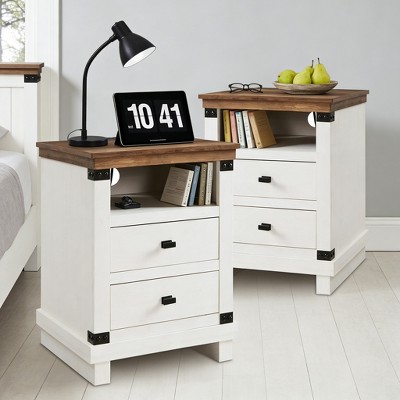 18" Farmhouse Nightstand Set of 2 with Charging Station, End Table with 2 Drawers Storage for Bedroom, Living Room, White