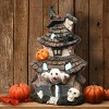 This tabletop Halloween decoration has a ghost bursting through the window of this two-tiered haunted house with a witch’s hat at its apex. Other creepy additions include a pumpkin, skull and large spider. Inside the house is a single battery powered multicolor LED light that glows through windows and cutouts. Constructed of strong yet lightweight polyresin material.