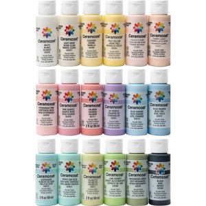 - CONVENIENT SIZE - This versatile acrylic paint set includes 18 - 2 fl oz bottles of craft paint. The colors in this paint set include: Delta Ceramcoat Black, White, Salmon, Hydrangea Pink, Touch O' Pink, Tawny Light, Custard, Pale Yellow, Palmetto, Wedgewood Green, Surfboard, Blue Heaven, Blue Danube, Light Ivory, Pink Quartz, Tropic Bay Blue, Lime Sorbet and GP Purple