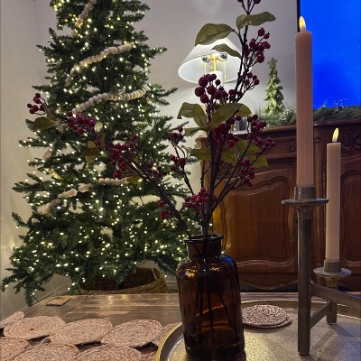 Make a striking statement with this Berry in Amber Glass Artificial Arrangement from Hearth & Hand™ with Magnolia. This artificial arrangement features lush green stems with red berries housed in an amber glass vase for a gorgeous look. The artificial construction makes it maintenance free, and you can place it on any flat surface along with other potted plants for a welcoming display.