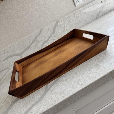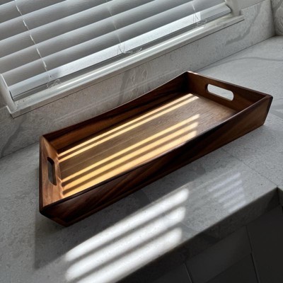 The Acacia Curved Tray can be used as a serving tray for your entertainment needs. It can also be used as a breakfast in bed tray. The high variation in the grain and knot pattern of acacia allows you to pair each piece with both light and dark colors inside any room. The wood tray is the ultimate in convenience, offering plenty of surface area to transport large quantities of food. The high side walls help keep things on the tray and the handle cutouts make for easy carrying. The Acacia Curved Tray is an elegant and wonderful addition to any home.