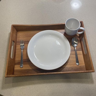 [This review was collected as part of a promotion.] This is such a beautiful tray and is absolutely perfect for breakfast in bed. The color and texture give it such a warm homey feel. The size is decent but not huge. It might not be big enough for a big breakfast. But I do like that it is compact and not too heavy. The curved design is minimalistic and stylish. The acacia wood grain is beautiful. This is a quality product. I received an incentive to write this review.
