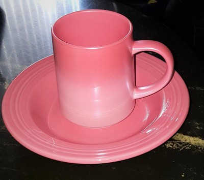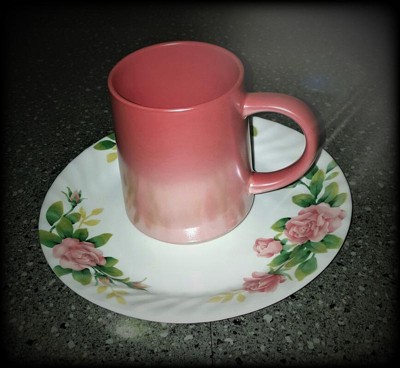 Beautifully designed mugs with a pearl like iridescent finish. Much nicer than can be shown here. The pink mug is almost a coral pink in hue and coordinates perfectly with my spring dinnerware (in photo) as well as Fiesta Flamingo dishes :) Nice quality, feels good in hand. Also ordered the white which has a certain casual elegance vibe. I wanted a 16 oz.+ mug without being overly huge, and I ended up with 2. Perfect!
