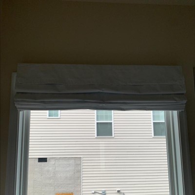 It looks pretty. But… we had to mount it outside above the window, so it hangs 2 inches away from the window allowing a lot of light the filter around the edge of the shades. They also do not help with temperature at all. I might try stapling it to the window frame under the extra piece that hangs down so then it will be up against the window. The up and down of the shades is really smooth and nice. Very nice. If I could get the shade to hang against the window instead of away from it and add some sort of insulation in the pockets it will be 5stars!