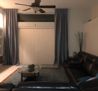 Beautiful shimmery blue curtains. They only filter the light but that’s all I wanted.