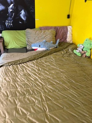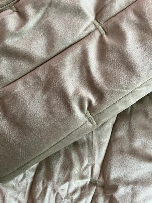 [This review was collected as part of a promotion.] This comforter set is absolutely gorgeous! The set comes with the comforter and two matching pillow shams. The color is lovely. I posted pictures in my review but it’s really hard to capture the right color as it changes depending on the lighting. It’s like a medium olive green with golden tones to it in my opinion, though with low light the color looks more dark olive and with high light the color looks more sage green. It’s definitely a great subtle statement for a room. The feel is velvety smooth and luxurious. It’s great quality and seems like it’ll hold up well. Overall 10/10. I can’t get over how beautiful it is!