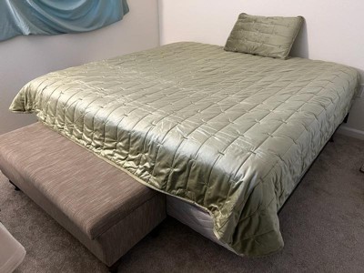 [This review was collected as part of a promotion.] I received this product free in exchange for my honest review. This quilt set is very nice if you are looking for something lightweight. The shams fit a standard queen pillow perfectly, and the quilt fits on a queen bed nicely. The quilt is thin, but also warm enough for summer nights. The outer fabric is a soft velvet, while the inside if the quilt is a soft, smooth polyester. The nature if the velvety fabric means that if you want it to appear smooth and unwrinkled like the product photos, you will likely have to steam or iron it. Otherwise, it appears more textured and slightly wrinkly, like in the photo I attached. In the set I received, there is a loose thread sticking out on quite a few of the embroidered rectangles, but they have not unraveled. Also, the color in person is different than the product photos. In person, the quilt and shams are more of a golden olive color rather than the sage color it appears to be, especially under warm lighting.