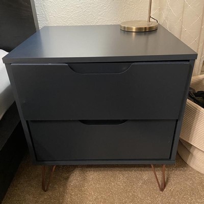 The Rockefeller nightstand is the perfect bedside table, with two drawers that are ideal for tucking away personal items, tablets, books, and beyond. Versatile in design with Mid-Century clean lines and modern splayed metal legs, this piece blends well with any existing decor and can be used from space to space.