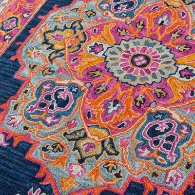 The saturated shades of this decorative area rug reinvent the classic Persian carpet in a vivid color palette. The captivating assortment offers a modern interpretation of traditional rug motifs, as vibrant pink, orange, blue and yellow tones form flowers, vines, palmettes and medallions in colors beautiful and bold. Hand tufted from 100% natural wool, each floorcovering makes a dramatic design statement as a focal point on floors throughout the home.