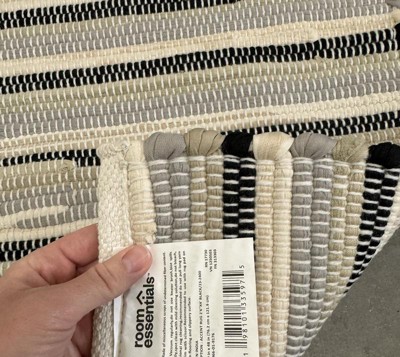 A: The rug features a woven striped pattern in gray, black, muted green, and cream hues.