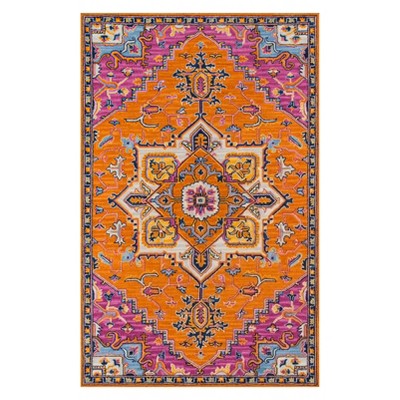 The saturated shades of this decorative area rug reinvent the classic Persian carpet in a vivid color palette. The captivating assortment offers a modern interpretation of traditional rug motifs, as vibrant pink, orange, blue and yellow tones form flowers, vines, palmettes and medallions in colors beautiful and bold. Hand tufted from 100% natural wool, each floorcovering makes a dramatic design statement as a focal point on floors throughout the home.