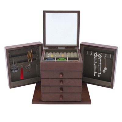 - 【Thoughtful Interior Design for Maximum Storage】The top lid features 8 hooks for necklaces and pendants to keep them tangle-free. The first layer includes 16 ring rolls, 30 earring stud holes, and 9 hidden ring holders. It also comes with a removable velvet pillow and 4 small adjustable compartments. The second drawer offers 20 divided sections, perfect for organizing rings, bracelets, earrings, and studs. The third drawer includes 4 large compartments for storing watches, brooches, bracelets, and other valuables
