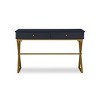 Work in style on the Blue and Gold Campaign Desk. The spacious top has a rich blue finish accented by the "X" styled matte gold legs. Small round gold knobs grace the front of the large storage drawer. Perfect for adding a pop of color and unique style to your office.