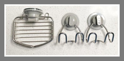 [This review was collected as part of a promotion.] FINALLY a soap dish and hooks that will stay in place in the shower!!!!! These items were packaged with care and were easy to "install." Just a few twists of the dial and they STAY PUT. They must be used on a completely flat/smooth surface. They hold a good deal of weight also. They do not leave any indentation or marks when removed. I highly recommend these hooks and this soap dish!!!