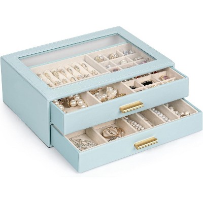 2-Layer Pink PU Leather Jewelry Box, Vintage Organizer with Removable Tray for Necklaces, Earrings, Rings, Bracelets Teal/Lake Blue 2 Layer