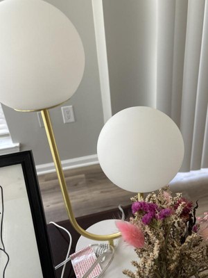 2-Light Zusa Metal Globe Table Lamp: Curved Stand, Frosted Globes, Modern Bedroom Lighting - 510 Design